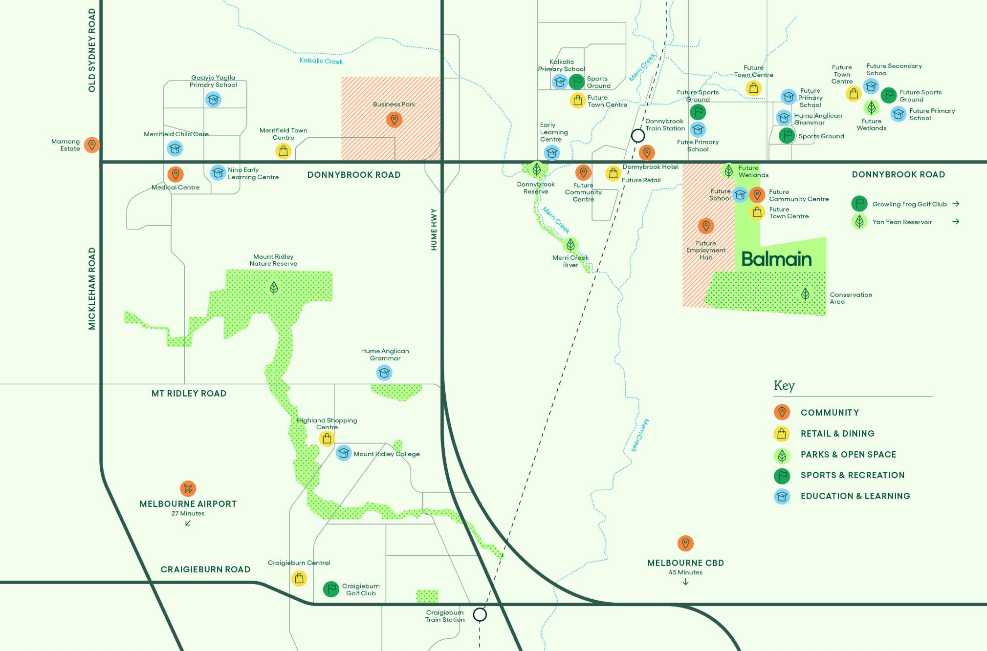 The suburb will include a network of shared paths linking the local parks and a new road network. Donnybrook Road and a new future state arterial road will provide access to the Hume Freeway, providing a direct connection to Melbourne CBD or northern Victoria.