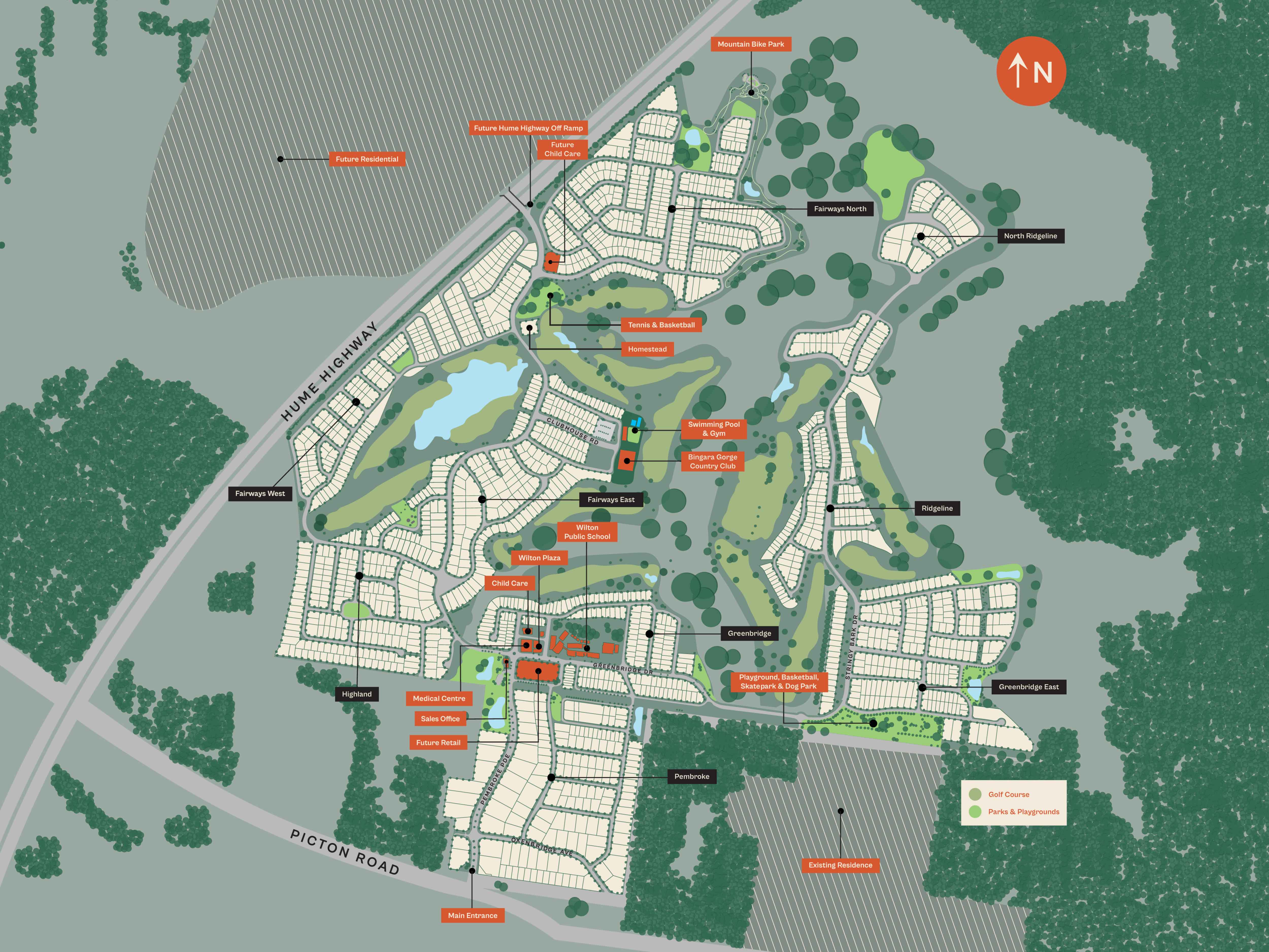 The Wilton township lies at the heart of the rural land holdings and consists of residential development, a school, and no central town centre. Pockets of new dense residential development are emerging towards the Hume Highway, close to the Bingara Gorge Golf Course.