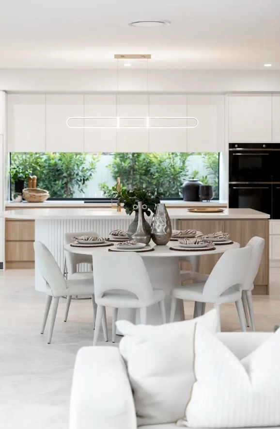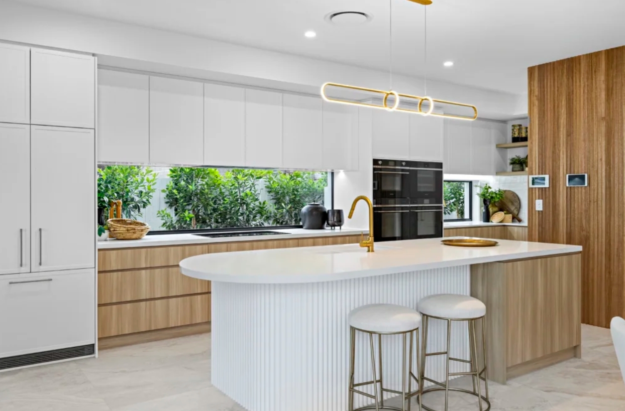 The interior features sleek curved timber walls with high ceilings and a neutral colour palette. Perfectly positioned windows provide an abundance of natural light creating a relaxed coastal atmosphere. The open plan kitchen, living and dining are strategically designed to flow seamlessly onto the alfresco and pool area, perfectly architectured to embrace the Queensland lifestyle.