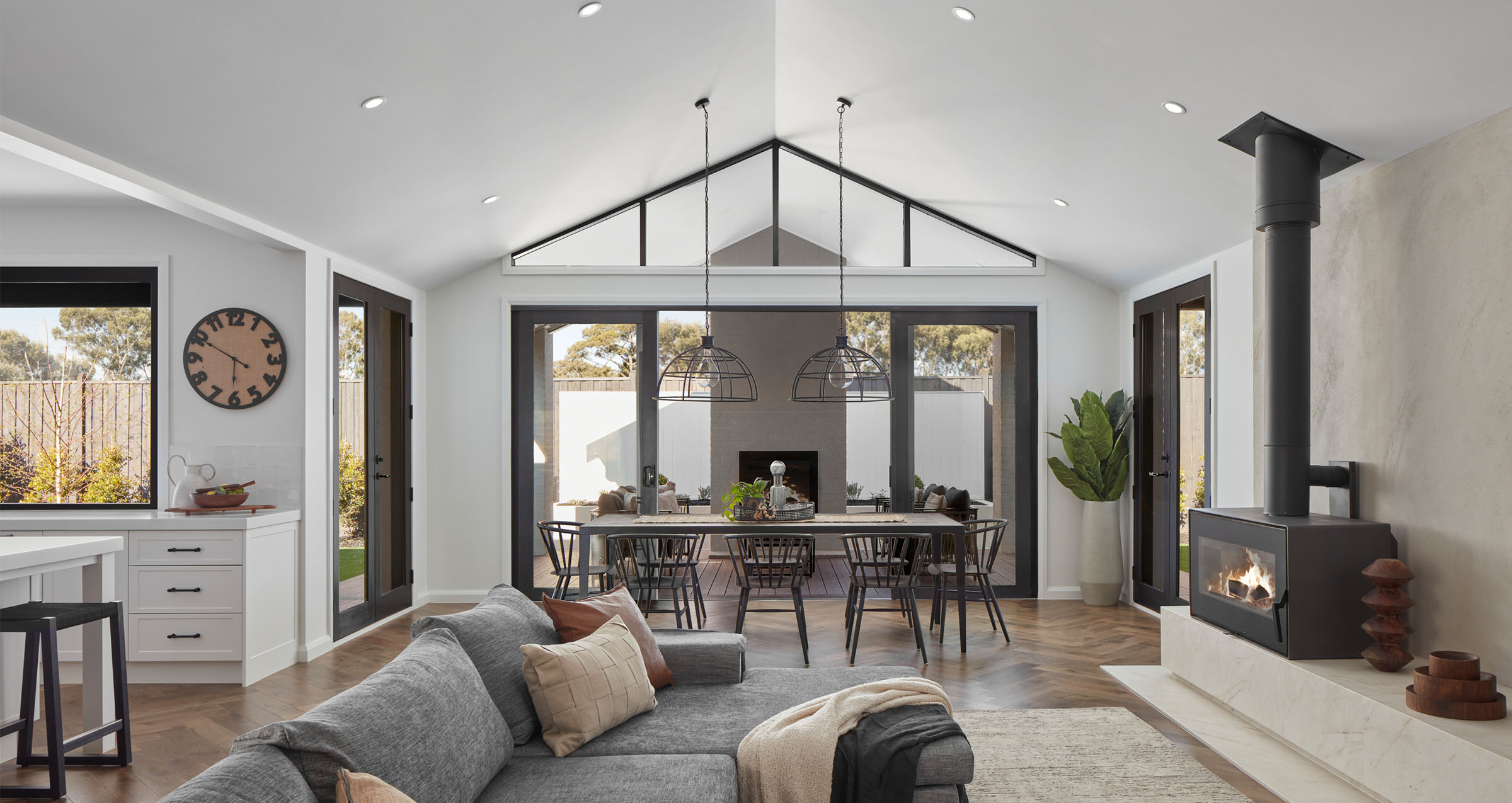 A farmhouse-style kitchen overlooks the main family living area and is within easy reach of the alfresco zone, where expansive glass sliding doors provide seamless connection between indoors and out.
