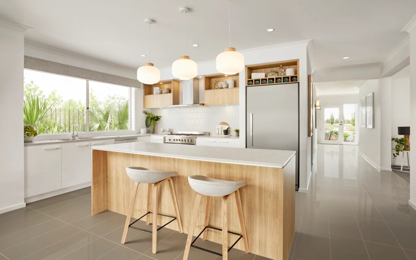Kitchen overlooking an expansive, light-filled meals and living area