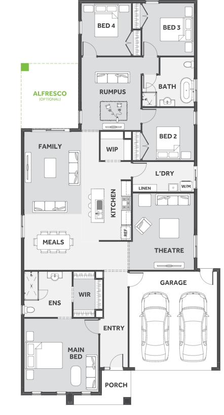 The s EIGHT range embraces open-plan living that is perfect for entertaining. The generous kitchen features plenty of bench space and a walk-in pantry, making cooking a breeze. The meals and family area flow onto the light-filled alfresco, while the theatre room acts as another secluded entertaining room.