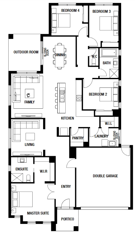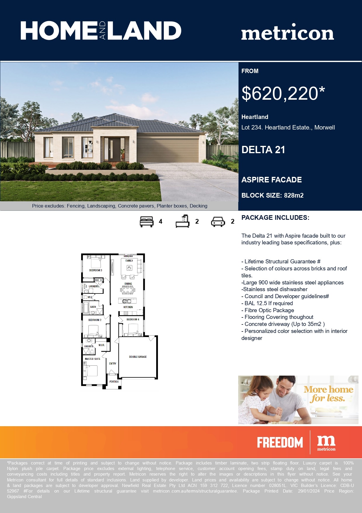 A new addition to the Freedom by Metricon range is the cleverly designed Langdon. Featuring four bedrooms, including a large master bedroom with ensuite and walk in robe, this home is sure to impress with its family friendly layout. Built around a central kitchen and family area, the single-storey Langdon is sure to please all the family with its use of space. The home design also includes a theatre room to enjoy the latest big screen blockbusters as well as an outdoor room to make the most of the size of your block of land.