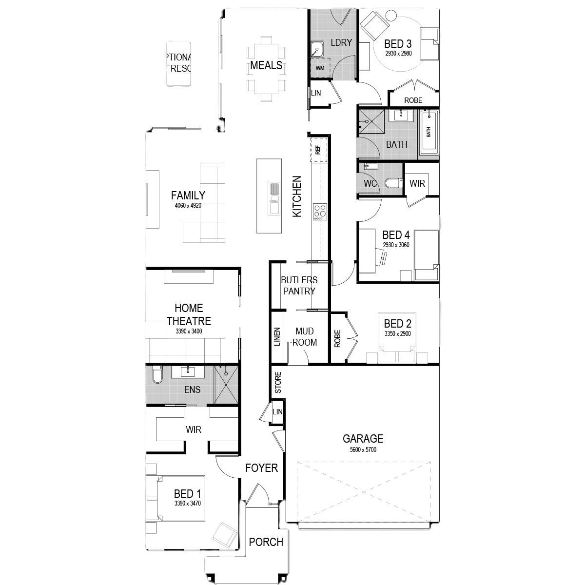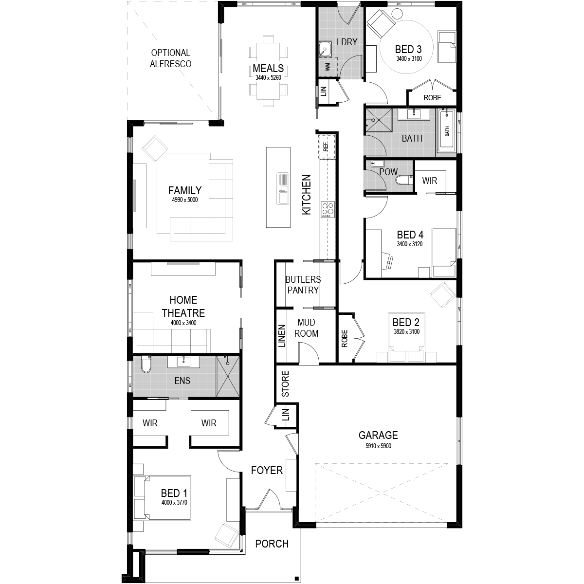 Despite being a smaller floorplan, a spacious porch preludes the foyer — welcoming you to the secluded master bedroom, with a dual walk-in-robe and ensuite. Ideal for a family movie night, the home theatre is comfortably located nearby the family room. A continuation of family living, the open-plan kitchen/meals/family zone is supported by the adjoining alfresco — plus a nearby integrated Butler’s Pantry, mud room and linen cupboard.