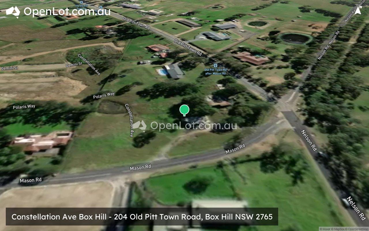 The suburb boundary is located along Boundary Road to the west and Annangrove Road to the east. The suburb boundaries are along Old Pitt Town Road to the north and Windsor Road to the south. Terry Road, Mount Carmel Drive and Nelson Road run through Box Hill, providing access to the surrounding suburbs and the local network of roads. Killarney Chain of Ponds continues from the adjoining suburb of Vineyard and splits into other smaller creek corridors connected by a series of water holes.