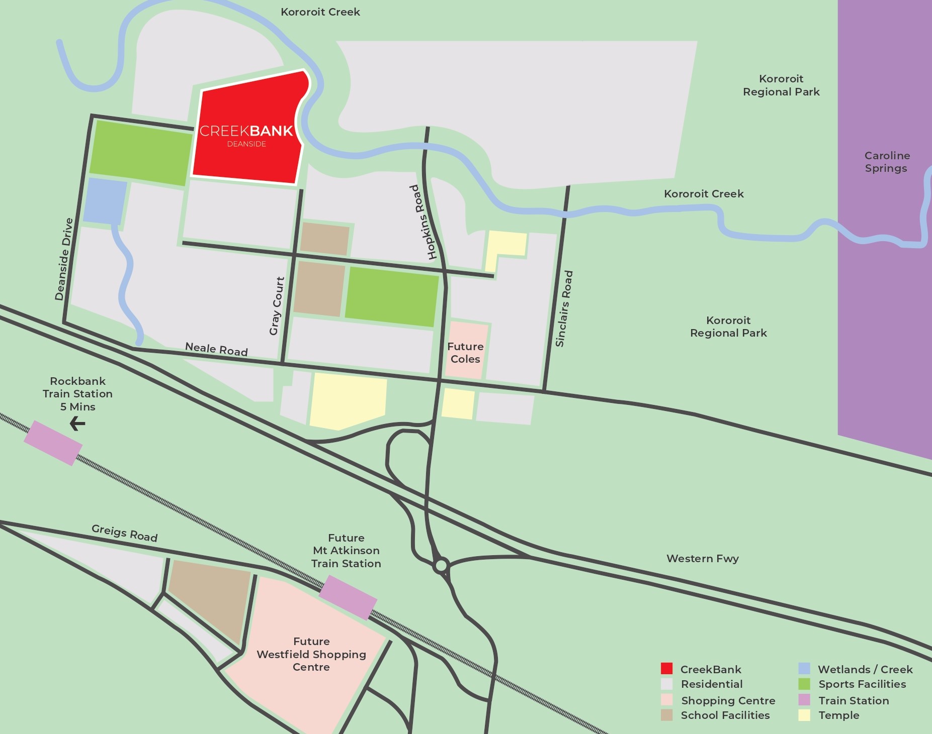 - EVERYDAY CONVENIENCE IS YOURS. Located just moments from Caroline Springs, CreekBank presents easy access to a variety of shopping, services and educational facilities. Great access to the new Westfield Shopping Centre which is a 4 minute drive.