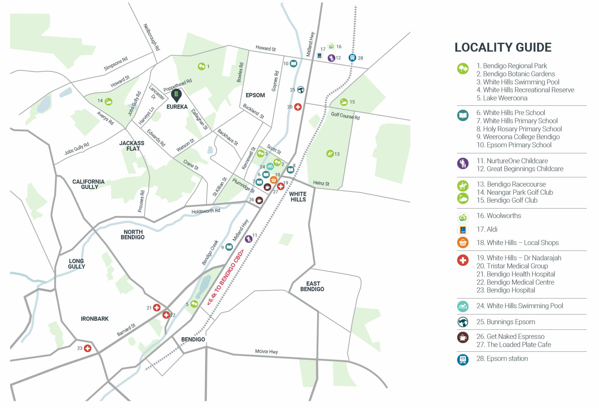 | Distance to | Bendigo CBD - 5 km north |