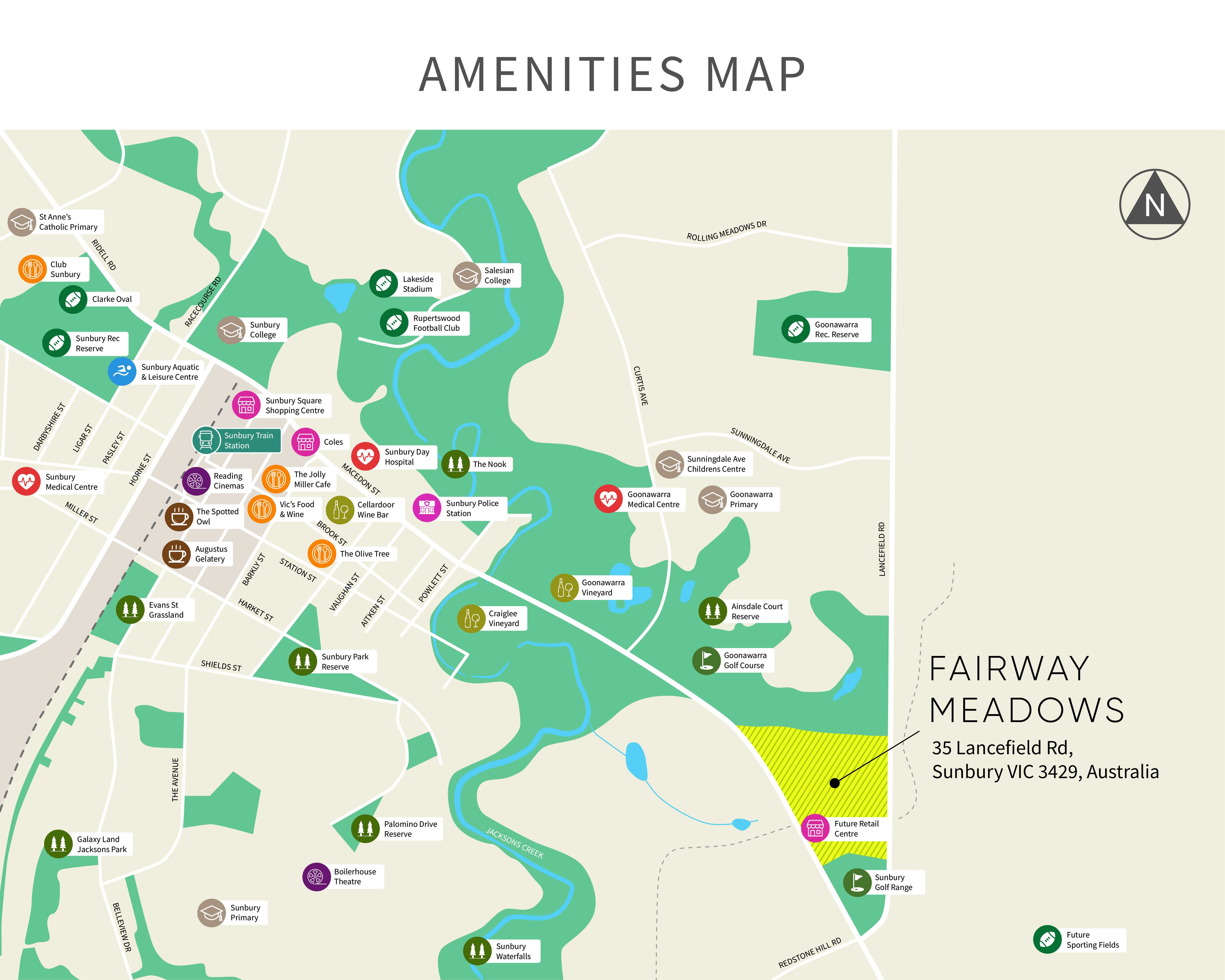 The suburb boundary is located along Jacksons Creek corridor to the North, with Emu Creek and Lancefield Road making up the eastern boundary. Watsons Road and Jacksons Creek provide the small southern boundary, with property boundaries and Calder Freeway providing the western boundary.