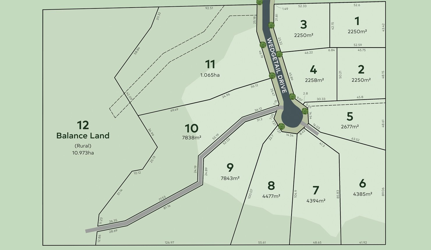 - Home to twelve large lots; from 1,250m2 to 1.05ha