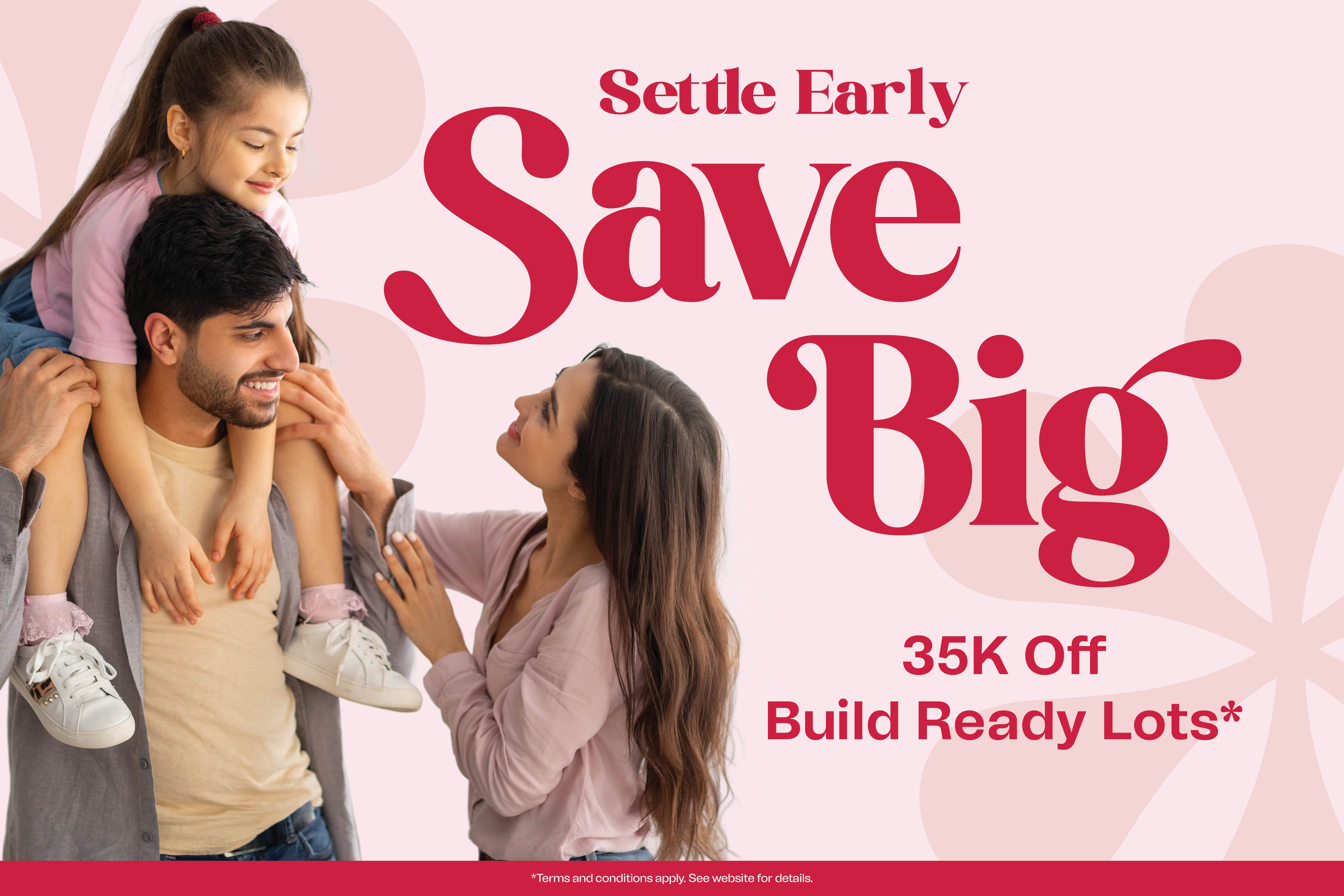 - Settle Early and Save Big, with $35,000 off build ready lots!*