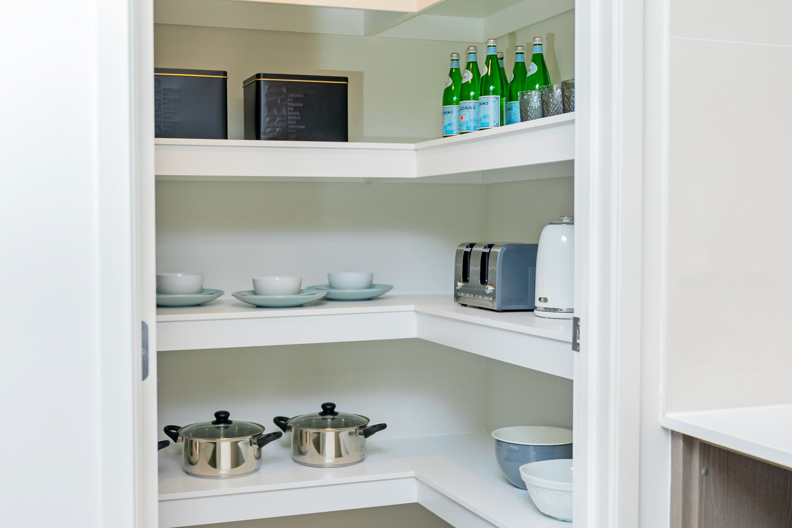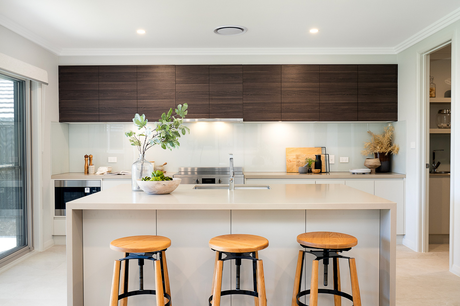 • Kitchen with stone bench tops and stainless steel appliances, soft-close drawers and glass splashback
