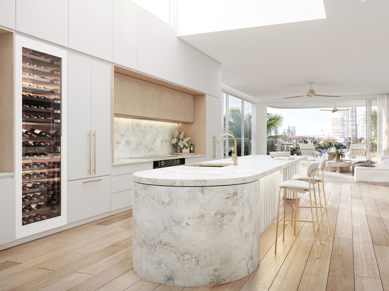 - Revel in luxury finishes, including opulent stone and timber features, harmonized with integrated appliances in the kitchen.