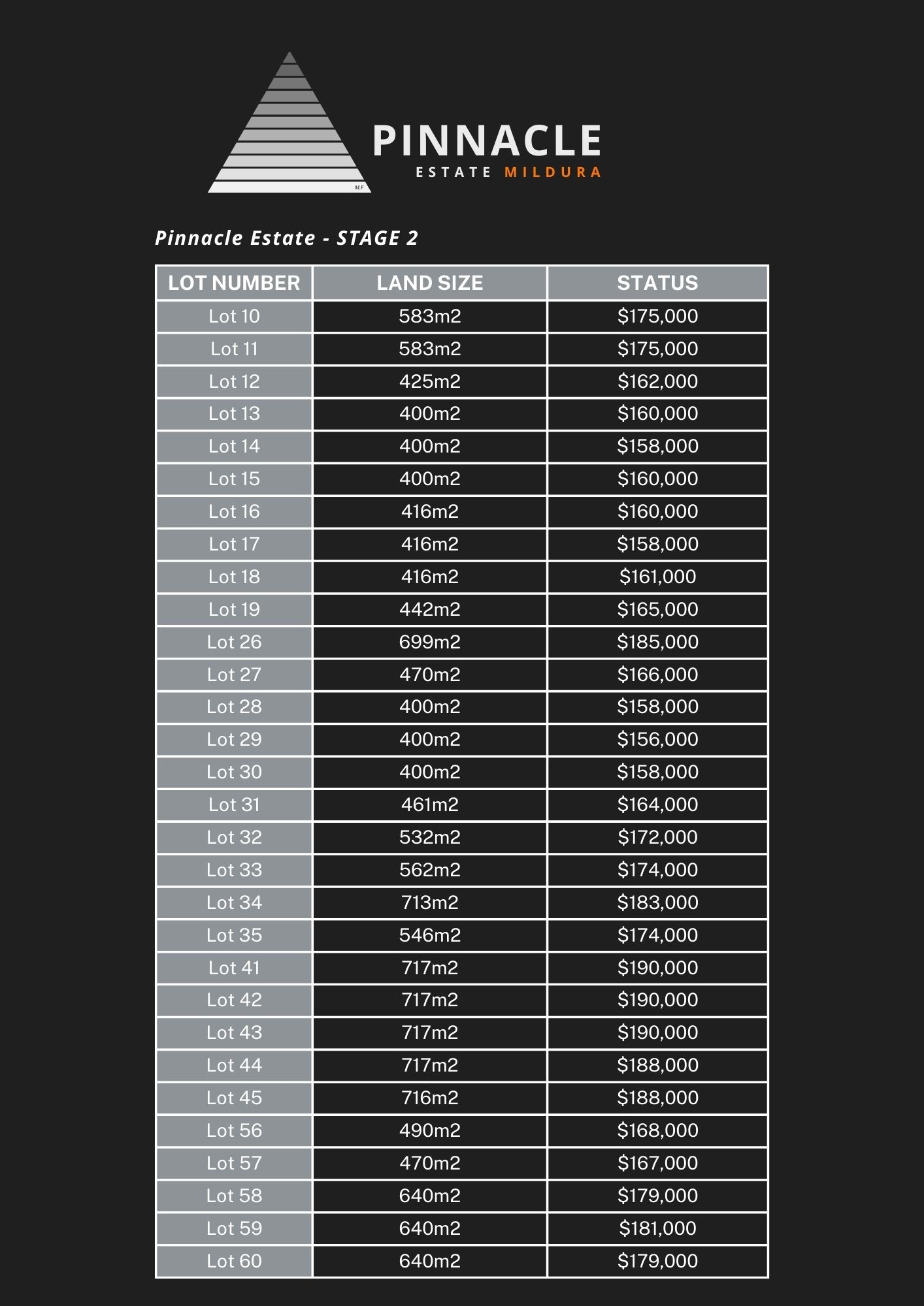 - Pinnacle Estate, positioned in Mildura's Growth Corridor and adjacent to Sunraysia's newest and most exciting new Supermarket & Shopping Development, has now released the long awaited Stage 2.