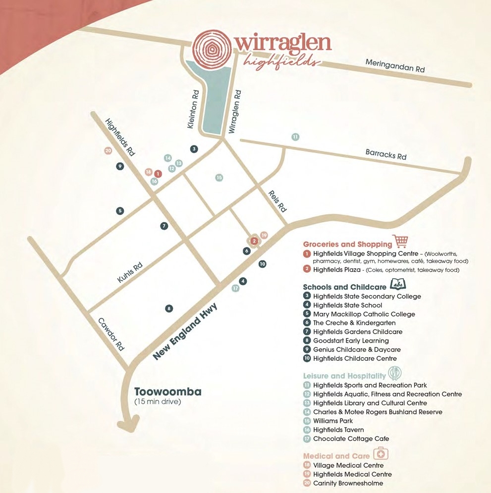 - Located at the juncture of tree lined Wirraglen Road and sweeping Kleinton Road, Wirraglen offers exceptional living just minutes from the Highfields town centre.